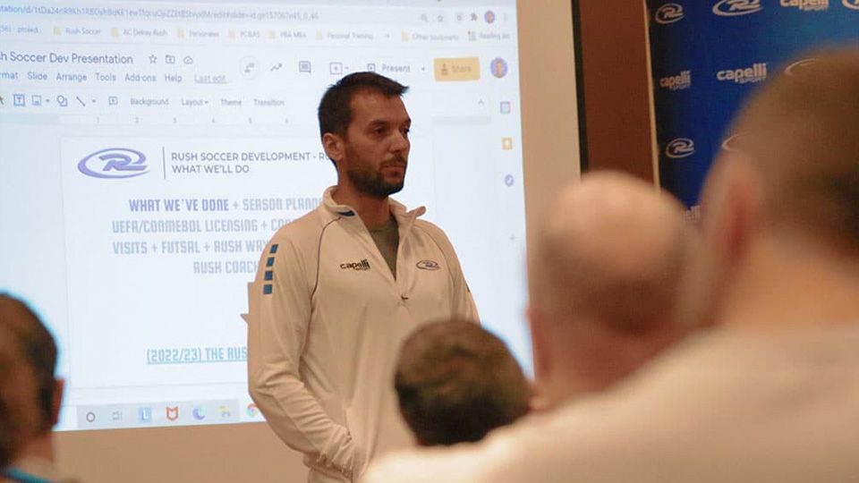 There was such a good atmosphere the first day, people were very connected, thoughtful, asking high-impact questions, so after two or three hours I decided to make a change in the schedule and, instead of starting with a presentation about Coach, Parent, and Player Educational Resources, I switched and presented about the Rush Way & our Player Development Approach. This, at the end, was the most important presentation I had during the entire event, because it was about discussing the cornerstones of the sporting project we have for the next ten years.